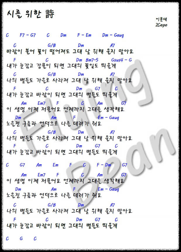 "시를 위한 詩"는 가사에서도 알 수 있듯이 언젠가 먼 길을 떠날 때 남은 사람들에게 전하는 노래라고 생각합니다. 특히 '그대 날 위해 울지 말아요.'라는 구절은 떠나는 이의 절절한 바람이 담담하게 담겨 있는 듯합니다.